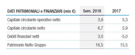 Continua il progressivo trend di rafforzamento degli indici patrimoniali e finanziari, con particolare riferimento al capitale circolante netto, incrementatosi di 4,5 mln. € rispetto alla semestrale 2017, e al debito finanziario netto, ridottosi di 8,5 mln. € nello stesso periodo di riferimento.